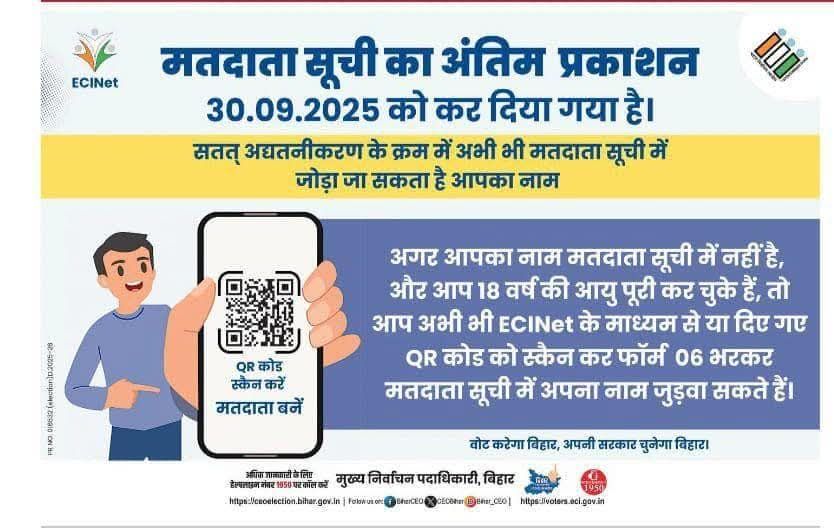 भारत निर्वाचन आयोग ने मतदाता पंजीकरण प्रक्रिया को और आसान बना दिया है। अब 18 वर्ष की आयु पूरी कर चुके नागरिक घर बैठे ही voters.eci.gov.in या Voter Helpline App के माध्यम से फॉर्म-6 भरकर अपना नाम मतदाता सूची में शामिल करा सकते हैं।